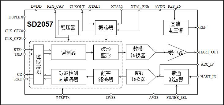 SD2057是一款专为实现HART协议而设计的CMOS单片调制解调器芯片,用于支持HART协议的现场仪表和控制器中。器件集成了所有必要的滤波、信号检测、调制、解调及HART信号波形整形等功能,所以芯片只需少量外围无源元件,即可满足HART物理层规范功能要求。