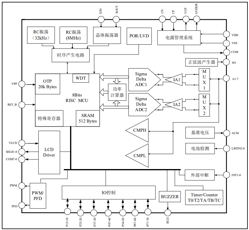 • 20k Bytes OTP程序存储器,512 Bytes SRAM 数据存储器